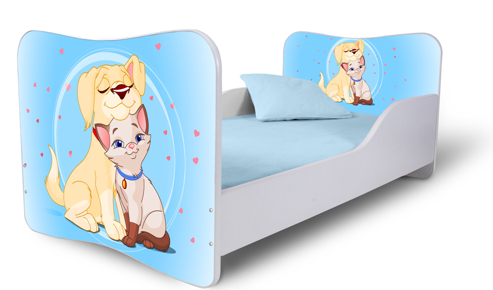 Dětská postel s motivem pejska a kočičky je vyrobena z tvrdých HDF desek. Jednolůžko je tedy odolné a dostatečné pevné. Hrany jsou zaobleny.