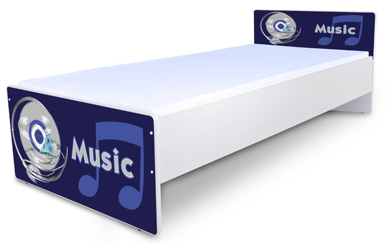 Jednolůžková postel s barevným potiskem na obou čelech umožňuje mladému člověku vyjádřit svůj vztah k hudbě. Barevné ladění postele se hodí zejména do dětského pokoje pro kluka. Odolný použitý materiál, který vyniká mimořádnou pevností a tvarovou stálostí je zárukou, že postel „prožije“ s dítětem kus jeho života.