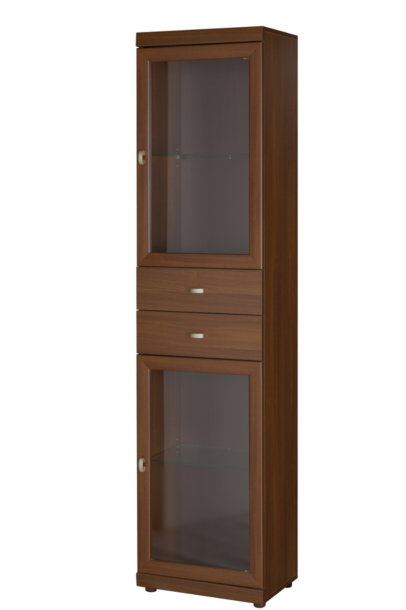Všem, kteří preferují nábytek laděný do teplých přírodních odstínů, můžeme doporučit prosklenou vitrínu Madelin 2, dostupnou v dekoru třešeň malaga a akácie královská. Úložný prostor je členěn na 2 prosklené skříňky s výplní z čirého tvrzeného skla a 2 šuplíky situované uprostřed (nosnost jednotlivých prvků je uvedena v přídavném obrázku). Dvířka a čela zásuvek jsou opatřena decentními kovovými úchyty pro snadnou manipulaci, montáž dvířek je navíc možné provést jak v levé, tak pravé variantě.