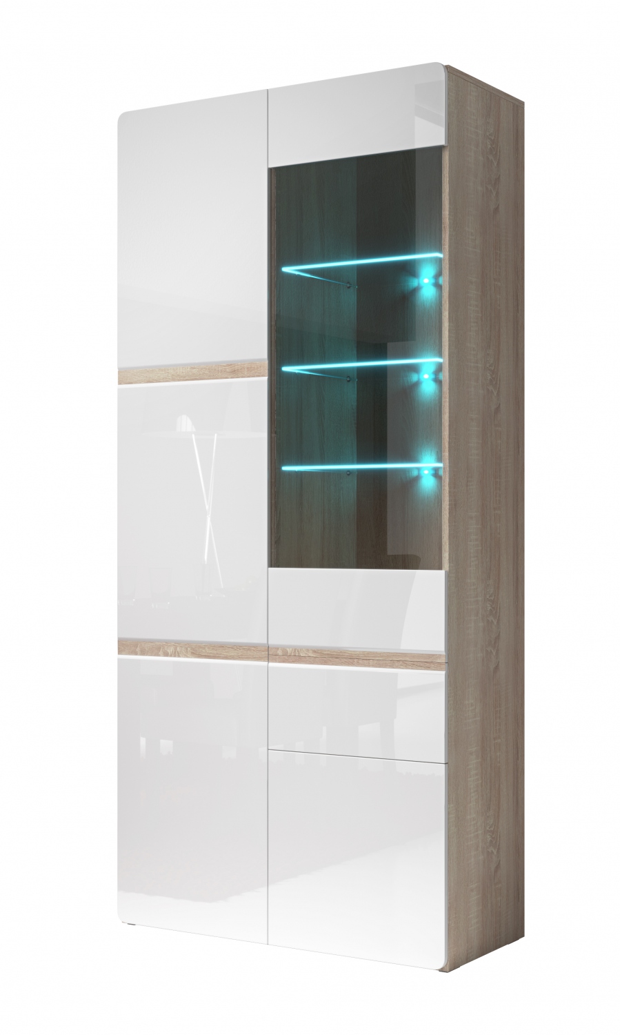 Moderní skříň s LED osvětlením máte k dispozici v kombinaci oblíbených barev. Bílá přední část působí velmi elegantně a nechá vyniknout předměty vystavené na skleněných policích. Korpus skříně je vyveden v odstínu dubu sonoma.