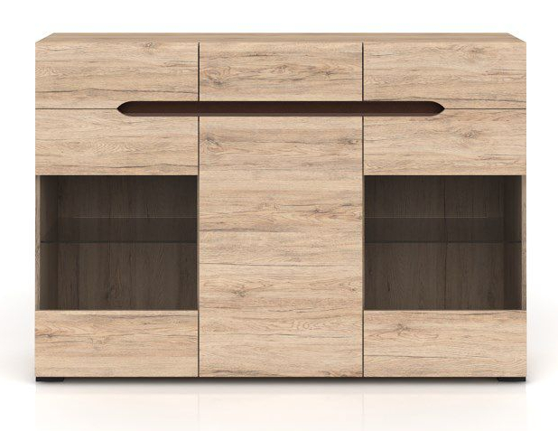 Komoda je rozdělěna na tři části. V horní části jsou tři šuplíky a ve spodních částech je po jedné polici. Boční části jsou prosklené, uprostřed jsou pevná dvířka. Vitrína je z lamina, které jí dává dostatečnou pevnost a žádoucí stabilitu.